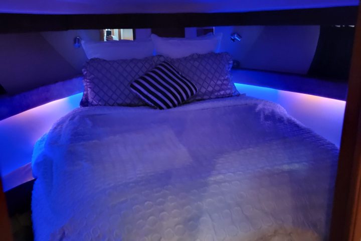 It is 36-foot Meridian Yacht. It has two bedrooms, one bath with toilet and shower, Living room area open to the kitchen with a refrigerator on the lower level. It is a two-level Yacht, with lower area as living area with two smart TV’s and a Bluetooth sound system, and outdoor second level has seating for guests. The front of the boat has comfortable built-in mats for sunning and entertainment area.